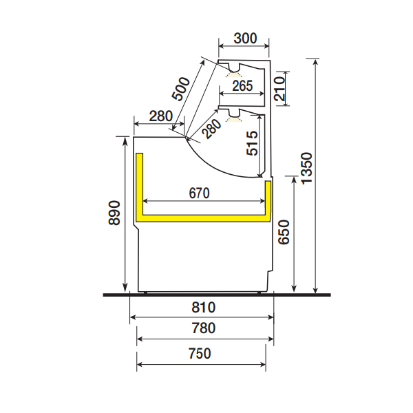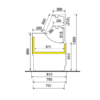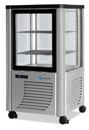 Piano lavoro in acciaio inox. Spalle laterali in ABS termoformate, piano espositivo in acciaio inox 304, illuminazione superiore, quadro comandi con termostato elettronico e sbrinamento a pausa, bacinella raccogli condensa a scarico manuale. Vetro intermedio con illuminazione di serie, non refrigerato. Tutti i vetri sono temperati.