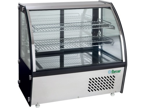 Espositori refrigerati con vetro curvo – ventilati. Espositori refrigerati con vetro curvo da banco con refrigerazione ventilata. Quattro lati espositivi – panoramica di tutti i prodotti – efficienza termica data dal vetro camera – sbrinamento automatico – controllo temperatura elettronico – struttura in vetro, materiale plastico e frontale inox – porte scorrevoli e luce interna a led.