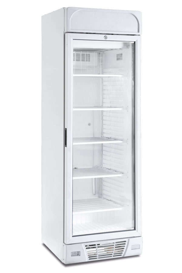 Freezer verticale statico con porta battente in vetro e agitatore FR 372 VGC ST colore bianco, capacità di 382 litri, con porta in vetro battente con doppio vetro temperato e guarnizione estraibile, che ne migliora la visibilità e l’isolamento. La superficie esterna è in lamiera preverniciata bianca con trattamento anticorrosione, che la rende resistente e elegante. Ha una refrigerazione statica con evaporatore a ripiani e un agitatore, che garantiscono una temperatura di esercizio tra -24°C e -18°C, ideale per mantenere i cibi congelati. Il freezer ha un termometro analogico e un regolatore di temperatura meccanico, che permettono di controllare facilmente la temperatura interna, è dotato di uno sbrinamento manuale e un’evaporazione automatica dell’acqua di condensa, che evitano la formazione di ghiaccio e migliorano l’efficienza energetica. Questa vetrina congelatore ha una chiusura automatica della porta e una chiusura con chiave per una maggiore protezione, ed una coibentazione dallo spessore di ben 6 cm. Internamente è dotato di una luce interna a Led e cinque griglie plastificate che permettono di organizzare meglio lo spazio interno. Il freezer è dotato di un cassonetto retroilluminato, di due ruote e due piedi che ne facilitano lo spostamento ed è di classe climatica 4, che significa che può funzionare in ambienti con una temperatura massima di 38°C e un’umidità relativa del 60%. Le dimensioni del freezer sono 64x67x187.5 cm.