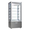 Vano espositivo in vetro temprato serigrafato colore bianco. Porta in vetro con maniglia invisibile a tutt’altezza. Struttura inferiore colore bianco. Refrigerazione ventilata con evaporatore nella parte inferiore della struttura; regolazione dell’umidità relativa con umidostato.