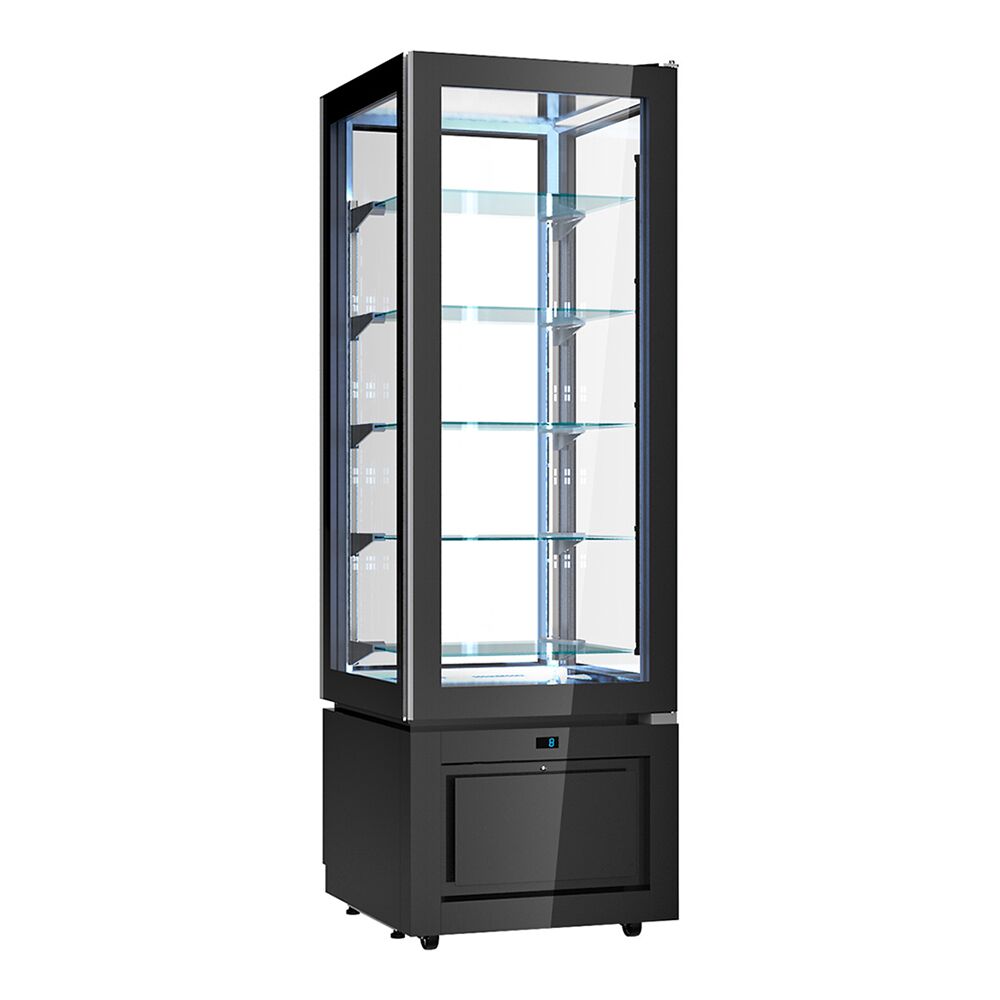 Vano espositivo in vetro temprato serigrafato colore NERO. Porta in vetro, maniglia invisibile a tutt’altezza. Illuminazione con barre led ad alta luminosità, anti abbagliamento. Struttura inferiore colore bianco. Refrigerazione ventilata, evaporatore parte inferiore della struttura.