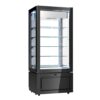 Vano espositivo in vetro temprato serigrafato colore NERO .Porta in vetro, maniglia invisibile a tutt’altezza. Illuminazione con barre led ad alta luminosità, anti abbagliamento. Struttura inferiore colore bianco. Refrigerazione ventilata, evaporatore parte inferiore della struttura.