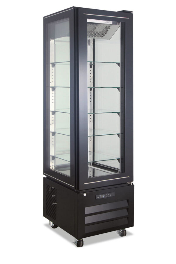 Il design total black con porta vetro senza cornice (frameless) e illuminazione LED verticale valorizza il prodotto, rendendola perfetta per pasticcerie moderne, hotel e locali premium.